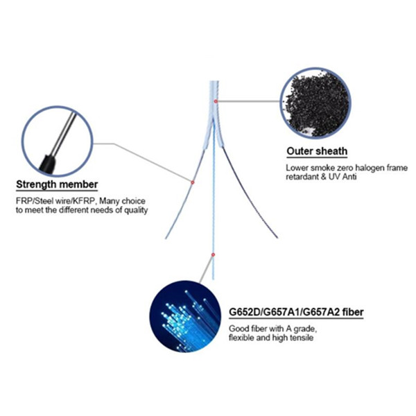 The optical fiber unit is positioned in the central. Two parallel Fiber Reinforced Plastics (FRP) are placed at the two sides. Then, the cable is completed with a black or color LSZH or PVC sheath..